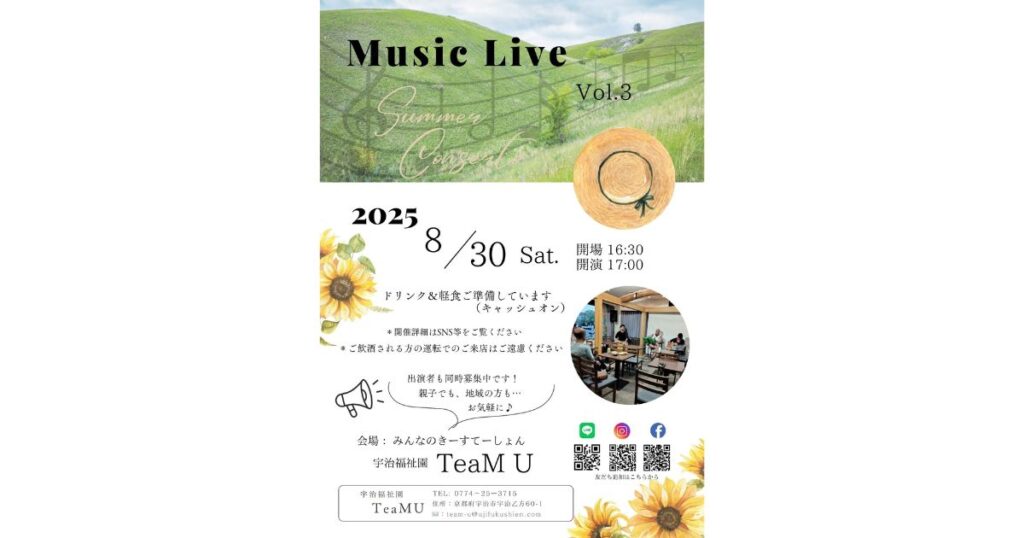 TeaMU 月例 mini LIVE vol.3 2025年 8月14日(土) 開場16:30 ・ 開演 17:00 会場 : みんなのきーすてーしょん 宇治福祉園 TeaMU ドリンク&おつまみご準備しています(キャッシュオン) ※ ご飲酒される方の運転でのご来店はご遠慮ください。 TEL : 0774-... -