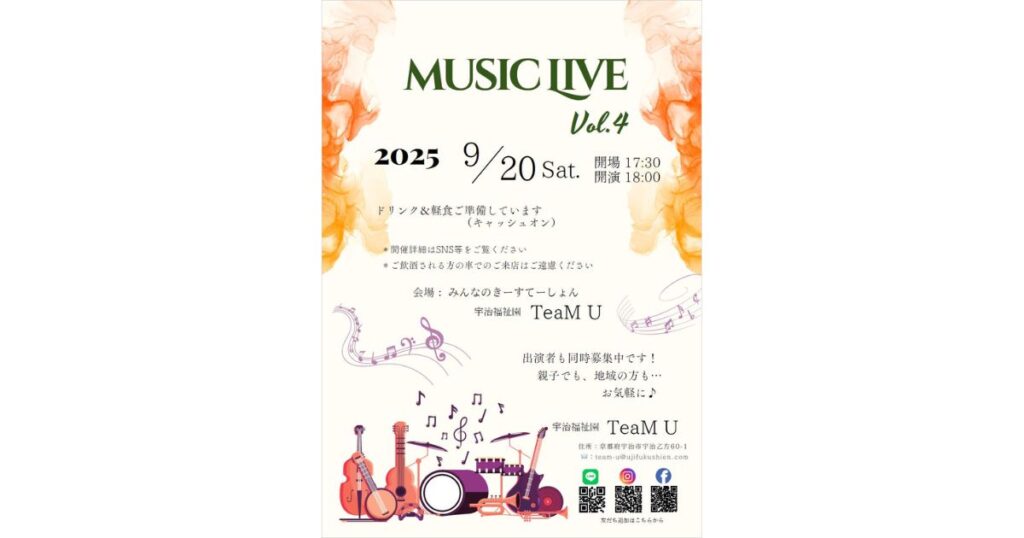 TeaMU 月例 mini LIVE vol.4 2025年 9月20日(土) 開場17:30 ・ 開演 18:00 会場 : みんなのきーすてーしょん 宇治福祉園 TeaMU ドリンク&おつまみご準備しています(キャッシュオン) ※ ご飲酒される方の運転でのご来店はご遠慮ください。 TEL : 0774-... -